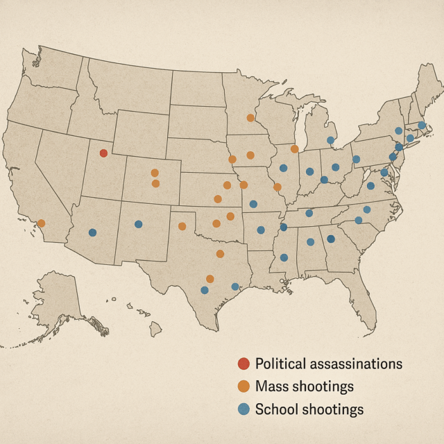 From the assassination of Charlie Kirk in Utah to the massacre in Uvalde, from the firebombing of a governor’s home to the shooting of state legislators in Minnesota, the violence is no longer fringe. It is woven into the fabric of our political and cultural life. And while the dots on the map may be color-coded—red for political, orange for mass, blue for school—the blood they represent is indistinguishable.